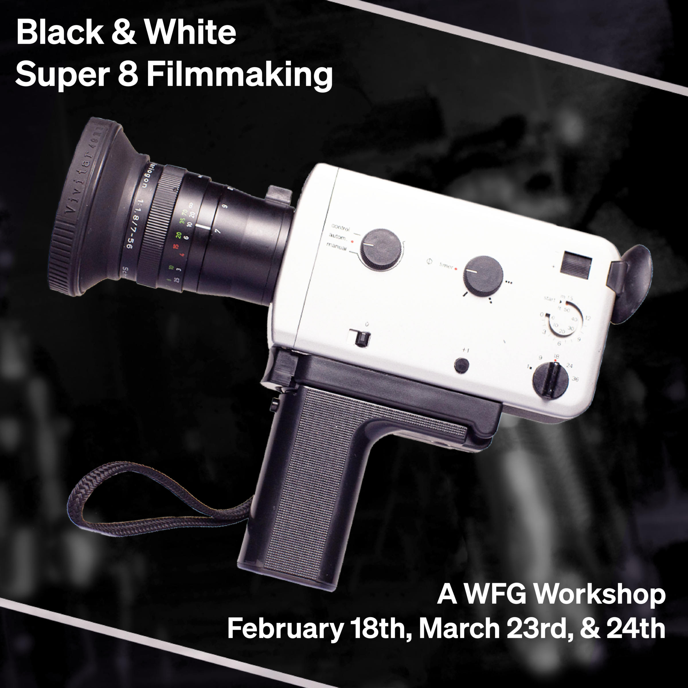 Participants will learn the operation of Super 8 cameras available at the Winnipeg Film Group and then shoot their own short black & white Super 8 film! We will bucket process the film by hand in the darkroom and learn various analogue editing techniques. Participants may view their film on an analogue projector, but will also be shown methods of digitizing the film on their own (or during the workshop if time allows).