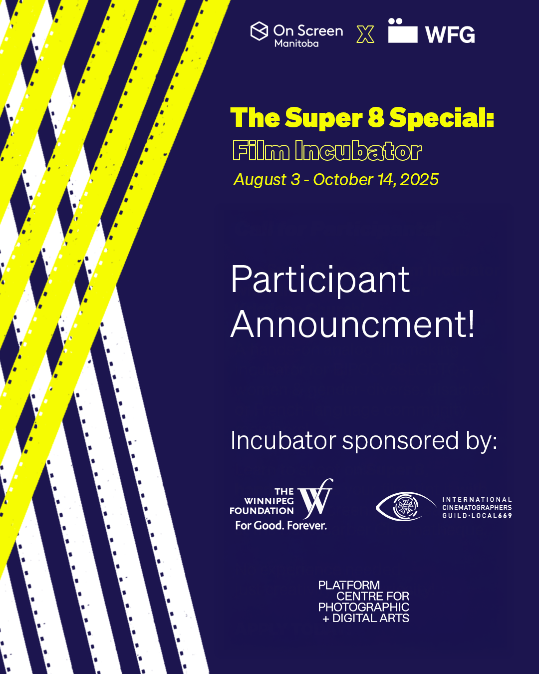 This incubator is made possible through the generous support of On Screen Manitoba, The Winnipeg Foundation, the International Cinematographers Guild of the International Alliance of Theatrical Stage Employees (IATSE) ICG 669 and PLATFORM centre for photographic + digital arts.
