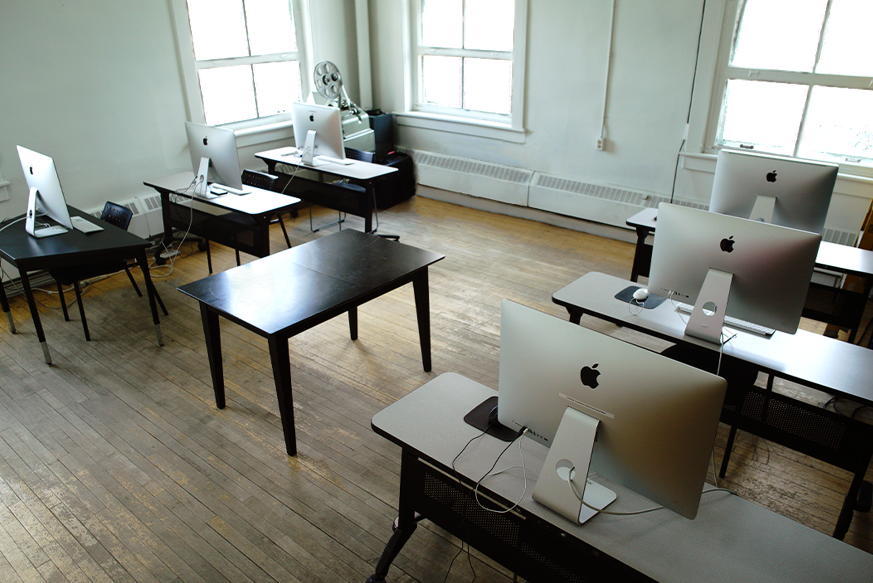 Our computer lab has 3 iMac computers, & 3 brand new Mac Minis with M2 Chips; all with Adobe Creative Suite, DaVinci Resolve (Basic), Final Cut, Dragonframe, Toon Boom Harmony, and more. Please note if you’re using the media lab, others may come in to use the computers around you. If you’d like to book the room to film or otherwise not use the computers, tables and Macs can be moved off to the side.